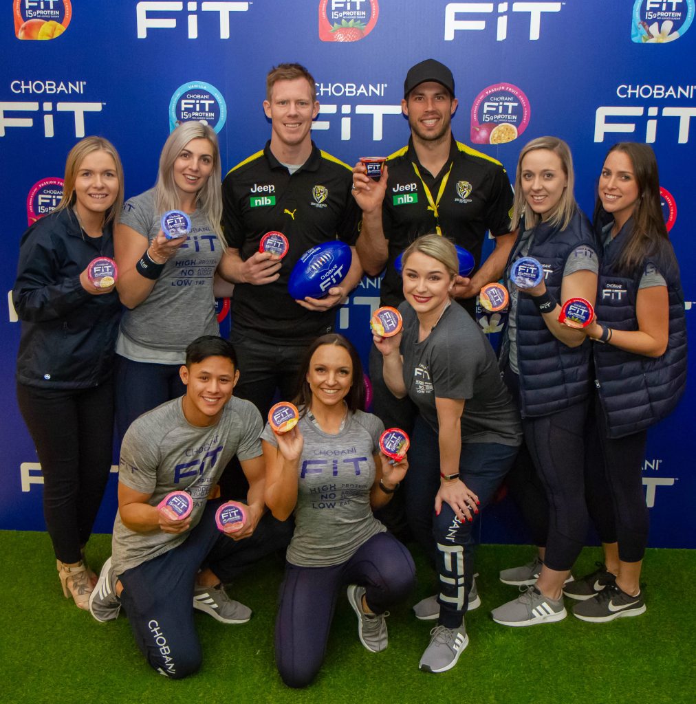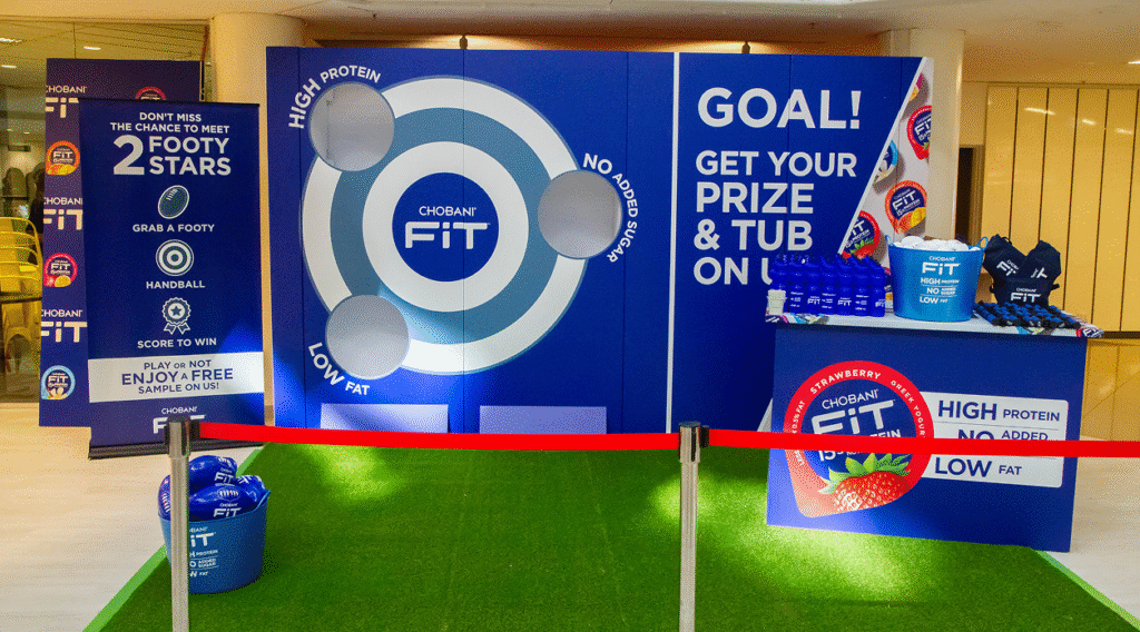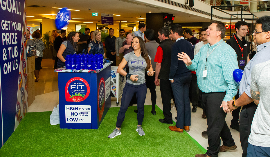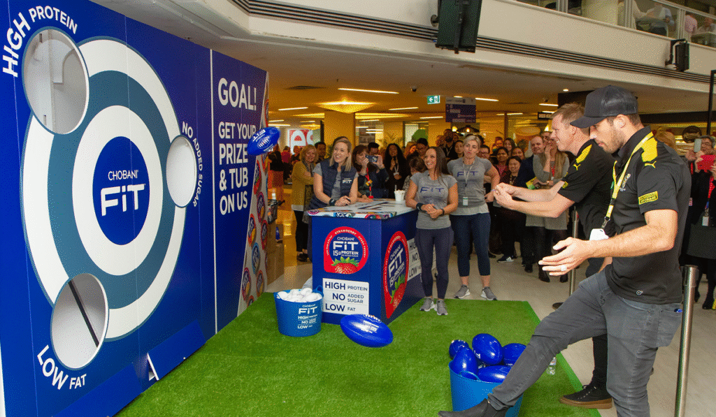 The pop-up experience was installed at key retail headquarters and centred around sport — with a nod to popular Aussie codes. Staff were invited to meet sporting heroes, take part in a handball competition, and sample the new Chobani FiT range.